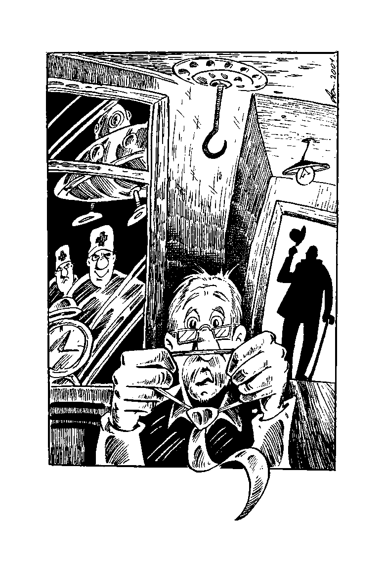 На третьей планете было уже темно, поэтому решили садиться точно по координатам, указанным в лотерейном билете — прямо в клумбу перед зданием Лотерейного Центра. Сели и осмотрелись… Если это был Лотерейный Центр, то тщательно законспирированный и замаскированный под обычное жилое здание. Ишаков нигде не было видно — засада, значит, в самом Лотерейном Центре. Вошли… Лифт был открыт, но не работал. Оставили в нем скафандры и бегом отправились на девятый этаж. Глухой Черт скакал впереди по ступенькам, с беспокойством разглядывая лестничные площадки. Крашеные двери и двери в коже, глазки, звонки, половые коврики, медные таблички… «Перспективный бакалавр-биоэнергетик Такой-то», «Доктор органовведения Растакой-то», «Инженер-вахмистр Этакий»… Кащей уже чувствовал, что сейчас произойдет одно из тех недоразумений, которые так не вовремя украшают жизнь… На девятом этаже решили позвонить в дверь с табличкой «Пенсионер особого назначения Разэдакий». Им открыл заспанный, еще не старый пенсионер в трусах. — Кто такие? Глухой Черт отодвинул пенсионера и вошел в квартиру. — Чего надо?! — заорал тот. Кащей протянул ему лотерейный билет. — Ты что, билеты распространяешь? — Тут указан ваш адрес… — Действительно… — удивился пенсионер. — Действительно, адрес мой… Впрочем, гляди, лопух! Планета третья, но с какого края? С внешнего или внутреннего? Глухой Черт вышел из комнаты, отобрал у пенсионера билет, перечитал адрес. Ударил себя кулаком по лбу и, нарушив многолетний обет молчания, многоэтажно выругался. Кащей взглянул на часы кассира… До средней галактической полночи оставалось совсем ничего. Он принес извинения пенсионеру особого назначения и заспешил вниз. Но глупый пенсионер не пожелал принимать извинений и схватил Глухого Черта за руку: — А талант у тебя есть, чтоб шляться здесь по ночам? О судьбе этого пенсионера история умалчивает. Надеемся, он остался в живых, потому что резать его ножом не было никакого времени. Глухой Черт свалил его одним ударом и захлопнул дверь. … Опять одевание скафандров в темноте лифта… Взлетели уже не таясь, с грохотом, на третьей космической скорости, разбудив всех окрестных ишаков. «Вечерний экспресс» болтался без дела на орбите. Радировали: «Планета третья, но не с того края! Ввели, понимаешь, нумерацию планет, будто в языке мало слов!» Матильда уже открывала шлюз. Экипаж поможет начинающему поэту, даже если придется сойти с курса. Протесты пассажиров побоку. Скафандры можно не снимать, сейчас будем на месте. Садитесь прямо на крышу Лотерейного Центра — здание внизу, конечно, оцеплено… За пять минут до полуночи Глухой Черт увлек за собой целую стаю дежурных патрульных ишаков, а Кащей в гордом одиночестве произвел посадку на крышу Лотерейного Центра — на этот раз без ошибки. Последние минуты ушли на то, чтобы сбросить скафандр и спуститься на девятый этаж к двери с надписью: «Регистрация лотерейных билетов».Часы за дверью стали бить галактическую полночь…