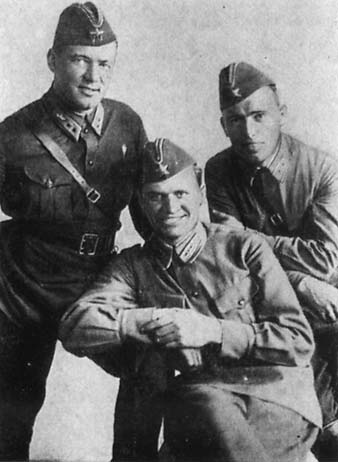 Командир звена истребителей С. Супрун (в центре) с друзьями П. Фокиным (слева) и А. Кубышкиным. 1937 г.