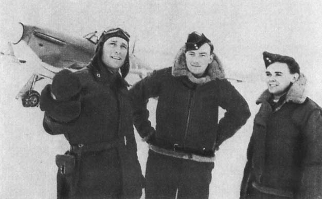 Первыми поздравили с успешным воздушным боем А. Хлобыстова (слева) друзья-однополчане. Апрель 1942 г.