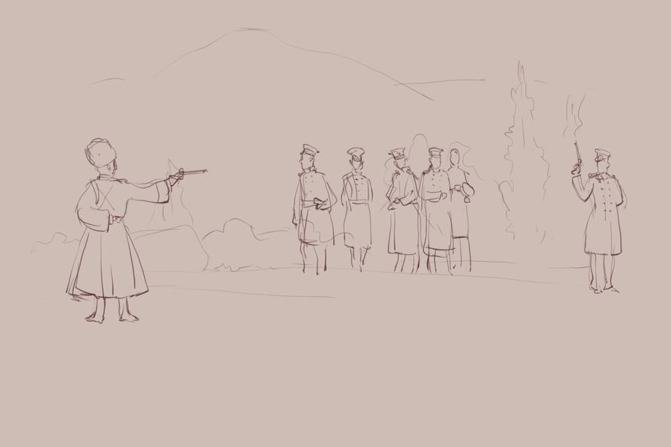 [1] Предупреждая гневные крики читателей, напомним: а) у нас альтернативная история; б) хотя прошло почти два столетия, до сих пор нет ясной картины «дуэли местного значения» у подножия Машука. Есть гора вранья, лжесвидетельств, непонятных показаний и маловразумительные отчеты следствия, проведенного спустя рукава. Даже И. Л. Андроников — этот мощный лермонтовед — вынужден был выдумывать фантастические теории типа выстрела от бедра от Мартынова. На такой поляне можно топтаться без страха быть обвинённым сказочником. Всего два вопроса. Первый: почему Дорохов, самый старший из всех, не остановил дуэлянтов? Второй: почему 30 июля, через две недели после дуэли, появился приказ о его награждении Георгиевским крестом? Все награды за экспедиции выходили по весне. Вот и спрашиваем себя: вы на чьей стороне были, господин бывший юнкер? [2] Кто-то скажет: авторы совсем ополоумели. Графоманские стишки втиснули свои. Ну, судите сами: «Скинь бешмет свой, друг Мартыш, Распояшься, сбрось кинжалы. Вздень броню, возьми бердыш И блюди нас, как хожалый»!