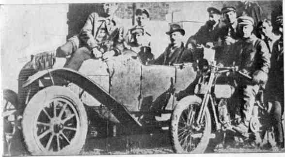 Друзья и ученики Жуковского (приехали навестить его в санаторий «Усово». На мотоцикле А. Микулин, рядом с ним сын Жуковского Сергей. За рулем «кадиллака» А. Архангельский. 1920 год.