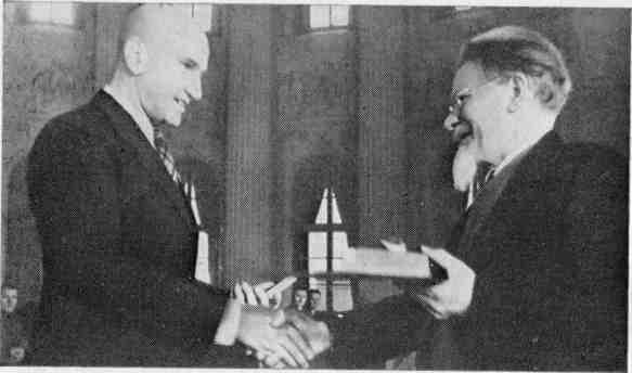 Председатель Президиума Верховного Совета СССР Н. М. Шверник вручает Микулину орден Ленина, которым был награжден опытный завод. 1947 год.