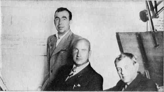 А. А. Микулин, слева — С. К. Туманский, справа — Б. С. Стечкин в ОКБ. 1950 год.