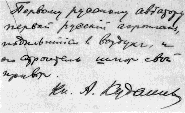 Автограф авиаконструктора А.С. Кудашева, адресованный М.Н. Ефимову