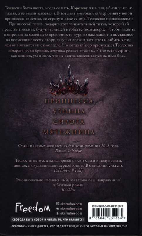 Мать Теодосии, Королеву пламени, убили, а ее страну завоевали. В один день девушка лишилась и семьи, и трона, и даже своего имени. Отныне ее все зовут Принцессой пепла. Унизительный титул, который она вынуждена носить вместе с пепельной короной, пачкающей лицо и одежду. Оказавшись во власти жестокого кайзера, Теодосия пытается выжить и не сойти с ума, ведь за малейшую провинность ее сурово наказывают. А если армия узурпатора терпит поражение, девушке достается еще больше плетей. Но когда кровожадный кайзер принуждает Теодосию совершить убийство близкого человека, девушка решает восстать. Она единственная надежда Астреи и ее богами забытого народа. Чтобы сражаться, у Теодосии есть острый, как клинок, ум и сила, что не всегда завоевывается на поле боя...