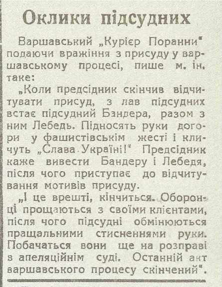 Варшава. Первый судебный процесс над членами ОУП 127 Львов. Второй судебный процесс над членами ОУП 149 Бандера и последствия судебных процессов 159