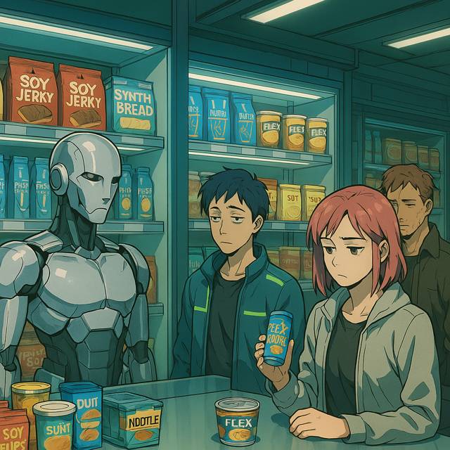 Он проходит мимо солдата без левой руки с массовым киберпротезом с пластиковым покрытием,