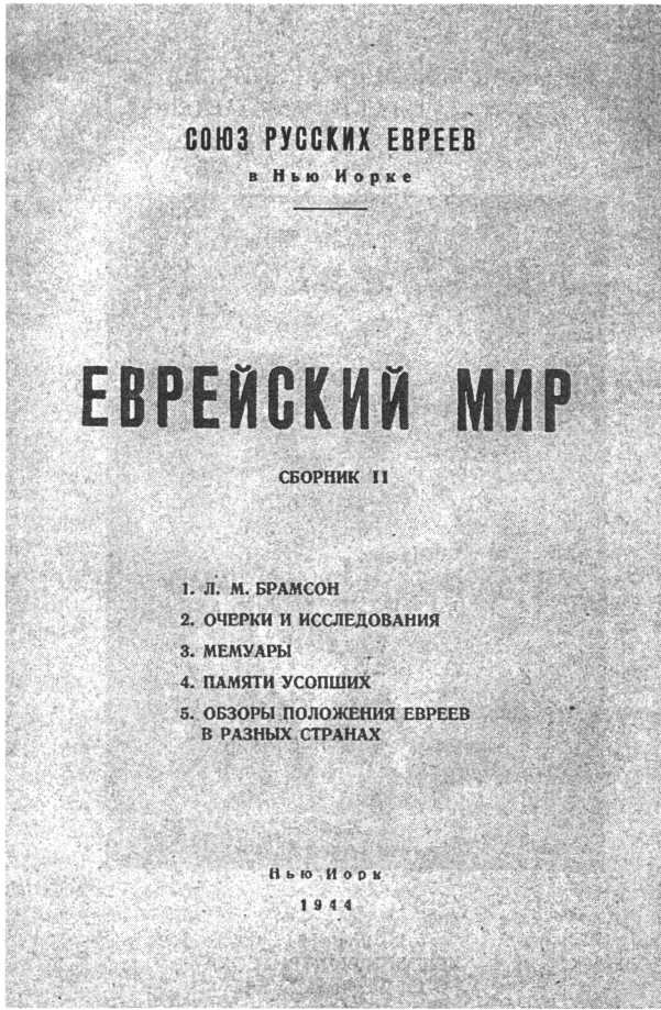 Союз Русских Евреев в Нью-Йорке по своему составу и целям является в известной мере продолжением «Объединения Русско-Еврейской Интеллигенции» в Париже, просуществовавшего от 1933 до 1940 года. Объединение старалось посильно сохранять славные традиции русского еврейства, которое в течение последнего века количественно и качественно занимало первое место в истории нашего вечного и всемирного народа. В России началось еврейское национальное движение, которое послужило главной базой и для творения Герцля и дало ему сразу целую армию последователей и активных работников. Здесь же впервые оформились и еврейские социалистические движения — Бунд и сионисты-социалисты, которые дали отрасли в различных странах иммиграции и были инициаторами рабочего движения и в Северной Америке. Новая еврейская светская литература также возродилась в прежней России и развивалась также в эмиграции, в Палестине и других странах (Бялик, Черниховский, Ахад-Гаам, Абрамович, Перец, Шолом Алейхем). То же можно сказать и о еврейской историографии на различных языках. После военных и революционных катастроф, начавшихся с 1914 года, русско-еврейская интеллигенция потеряла свою базу и стала постепенно слабеть от рассеяния и ассимиляции. Однако в различных местах еще долго существовали очень деятельные группы, оказавшие большое влияние на все стороны еврейской жизни. Большинство деятелей всемирной сионистской организации, Керен-Гайсод и Керен-Кайемет вышли из России. Моцкин и его русские сотрудники создали Всемирный Еврейский Конгресс для защиты прав евреев в голусе. В Париже долго существовала газета «Еврейская Трибуна» во главе с бывшим членом Думы Винавером. В Берлине издавался журнал «Рассвет», бывший центром сионистской оппозиции. Впоследствии Жаботинский перевел журнал в Париж, где он издавался в течение многих лет. Русские евреи создали также, или возродили в изгнании целый ряд международных союзов, как ОЗЕ, ОРТ, ГИЦЕМ, которые связали между собой для широких общественных задач еврейские общины различных стран. Если евреи, рассеянные по всему миру, выработали за последние десятилетия национальное самосознание, сблизились для общенародных задач борьбы и прогресса, то наибольшая заслуга принадлежит русскому еврейству и его интеллигенции. Однако вечный закон истории ведет всякую эмиграцию к ассимиляции и вырождению. Единственной основой культурного самосохранения является надежда на возвращение на родину или возобновление связей с русским еврейством, и если это затягивается, то наша историческая форма бытия, как бы ценна она ни была, постепенно растворяется и исчезает. Есть ли у нас эти надежды, могут ли они скоро осуществиться — это вопрос, на который пока нет ответа. Во всяком случае, остатки русско-еврейской интеллигенции продолжают жить в новых местах изгнания, и объединены русским языком. Настоящий сборник «Еврейский Мир» является продолжением первого сборника, изданного в Париже, накануне войны в 1939 году, и дает статьи по главным вопросам еврейской жизни, которые выдвинуты войною и трагическими событиями последнего времени. Много места уделено и обзорам прошлого и воспоминаниям об отошедших в лучший мир славных представителях русского еврейства. Естественно также, что сборник посвящается памяти Леонтия Моисеевича Брамсона, отда