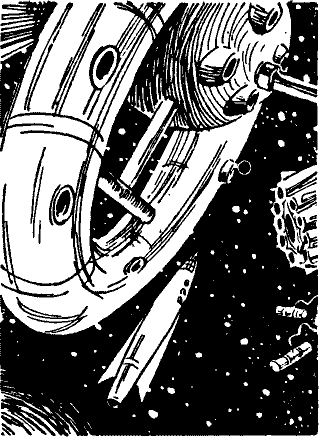 Сандомирский сидел за столом в кресле из легких алюминиевых трубок. Это был плотный мужчина, на вид лет пятидесяти. Характерная осанка, особая манера сидеть, не сгибая спины, выдавали бывшего военного. Три большие серебряные звезды на небесно-голубых, отороченных золотом петлицах указывали на его высокий ранг. Широкий ремень, закрепленный крючками на спинке кресла, удерживал на месте его мощную фигуру, так как предметы на искусственном спутнике не имели никакого веса. Этот ремень предохранял Сандомирского от опасности взлететь к потолку, как детский воздушный шар, что едва ли было уместно для его высокого звания, да еще во время служебного разговора. Одинцов стоял у стола. Магнитные пластинки на каблуках и носках башмаков придавали ему необходимую устойчивость и позволяли держаться прямо. Разгоряченный разговором, который, как всегда, перешел в спор, Одинцов сдерживал себя, не желая проявить неуважение к старшему, но упорно отстаивал свою точку зрения. Откинув резким движением головы прядь русых волос, упавших ему на лоб, он убеждал начальника: — Николай Александрович, мы летаем уже не первый год. Конечно, ошибка была бы роковой. Но ее не должно быть! Сандомирский поудобнее переместил большое тело в кресле: — Да ведь у вас учебная ракета. Понимаете, упрямец? У-чеб-ная! Вы не хуже меня знаете, что она не рассчитана на сопротивление воздуха при движении в атмосфере, приспособлена только к полетам в мире без тяжести, поэтому и имеет ограниченный запас прочности. А вы хотите на такой скорлупе удариться о поверхность Земли! Представляете, что может получиться? Тормозить нечем значит, приземление произойдет непременно на большой скорости. Вы с вашей ракетой будете похожи на коробку с кильками, которую переехал грузовик. — Николай Александрович, наземные транспортные ракеты имеют крылья немногим больше, чем наши стабилизаторы. Однако садятся же они без всяких аварий! Тут ничего сложного нет. Можно и в данном случае использовать сопротивление атмосферы. — Малейшая ошибка в расчетах — и ваш снаряд раскалится добела и сгорит, как метеор! — Николай Александрович, такая судьба ожидает мелкие песчинки размером с булавочную головку, — не сдавался Одинцов. — Более крупные метеориты раскаляются только снаружи, внутри же остаются холодными и падают почти без удара, постепенно теряя скорость. А ведь в ракете будет человек! Он может бороться с температурой. Было ясно, что молодой пилот вступил в спор, готовый ответить на любые возражения. В его серых глазах светилась воля, а рот в те минуты, когда он почтительно выслушивал мнение начальника, был плотно сжат. Оба говорили не повышая голоса, но сферический потолок усиливал звуки, и слова казались произнесенными очень громко. Все было необычно на искусственном спутнике. Постройка этого гигантского сооружения являлась чрезвычайно сложной технической задачей. Искусственный спутник был собран из нескольких сигарообразных ракет, последовательно вылетавших за пределы земной атмосферы. В первой из них отправился в пространство отряд строителей, которые затем принимали остальные ракеты, управляемые с Земли. Ядро внеземной станции состояло из пяти гигантских космических снарядов. К ним постепенно присоединялись всё новые и новые ракеты, доставлявшие людей, оборудование, материалы, готовые стро