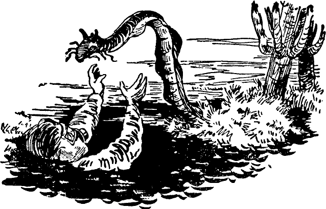 Перед вездеходом постепенно образовалась просека длиной в несколько десятков метров. Теперь в сплошных зарослях кустов замелькали просветы. Чаща кончалась. — Все! — сказал Красницкий. — Сейчас я посмотрю, что там впереди. Бросив пилу, он пошел между стволами, прихрамывая и перебираясь с пня на пень. Виктор Петрович оставил работу и следил за ним. Светлая одежда была хорошо заметна в полутьме леса. Все было тихо вокруг, и эта тишина успокаивала. Но вдруг Красницкий издал отчаянный крик, метнулся в сторону и упал. Академик потерял его из виду. Выхватив пистолет, Виктор Петрович бросился на помощь товарищу. Красницкий лежал лицом вверх. Его обвило какое-то живое существо, которое академик сначала принял за гигантскую змею. Круглое тело этого темно-красного пресмыкающегося сжало ноги Красницкого в своих кольцах и притиснуло ему левую руку к груди. Правая была свободна. Красницкий, очень сильный человек, пытался разжать свободной рукой отвратительное кольцо, но ему не удалось. Небольшая конусообразная голова чудовища на гибкой, способной удлиняться и укорачиваться шее быстро двигалась над лицом несчастного и, казалось, выискивала место для укуса. Виктор Петрович, не теряя ни секунды, выхватил острый как бритва нож и довольно неловко, но основательно перерезал тело змееподобного существа.