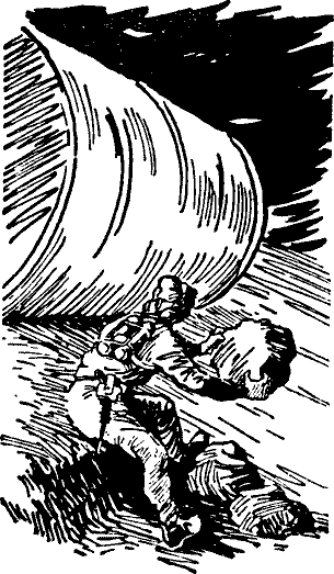 Шторм не затихал. Порывистый ураганный ветер был так силен, что люди на берегу едва держались на ногах. Не лучше было и на борту подводной лодки. Яростные волны швыряли ее, как щепку. Едва маленькое судно приблизилось к берегу, как они подхватили его и выбросили на камни. Противный, скрежещущий звук раздираемого металла был слышен даже сквозь рев бури. Спрыгнув с палубы прямо на утесы, Владимир подумал, что подводная лодка, оказавшая астронавтам столько услуг, пожалуй, закончила свое существование. Этот рейс действительно оказался последним. Но сейчас не приходилось задумываться — надо было спасать Наташу. Он оглянулся и увидел, что жена уже успела благополучно выбраться на берег и без его помощи. Цистерны с силанами, которых достигали волны, катались по берегу и норовили очутиться в море. «Разобьются! — мелькнуло в голове у Владимира. — Тогда все пропало! Удержать их! Во что бы то ни стало удержать их на берегу!» В такие минуты мысль работает особенно быстро, а силы удесятеряются. Одинцов схватил огромный камень, оказавшийся поблизости, с натугой дотащил к месту, где волны швыряли цистерны, и бросил под катившийся в море круглый резервуар.