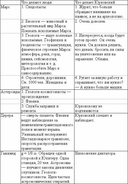 Эта глава — соответствует «Быту мушкетеров» у Дюма. Характеристики всех действующих лиц, их нравы и привычки с точки зрения Юры. И попутно — описание превосходного межпланетного корабля. Все через восприятие Юры. Поражен, что Быков почти ничего не делает. Капитан на корабле не нужен — только перед стартом и на случай катастрофы. Это Юрковский, не поднимая головы, сквозь зубы: «Или в случае бедствия». Быков проводит дни в кают-компании, рассеянно принимает донесения от Крутикова и Жилина, главным образом — систематически и методически читает журналы и газеты за два последних месяца и смотрит кино. В каюте — никаких украшений, только фото жены и детей. Юрковский, напротив, работает очень много и легко — непрерывно принимает и отправляет радиодепеши, читает какие-то материалы, сердится, ругается. Под внешним барским хладнокровием большая тревога и нетерпение. Юру называет прапорщиком: «Э... послушайте, прапорщик, а не можете ли вы вакуумно сварить обед?» Привык выпендриваться. Пытается выпендриваться и перед Быковым, но тот его хладнокровно осаживает. Рассуждение Юрковского про пистолет. В каюте — все признаки роскоши. Очень много подушек специального назначения. Михаил Антонович считает курс, вздыхает насчет пенсии, жалуется, что это его последний рейс, сообщает, что вот теперь пойдет детишек нянчить — внуков и внучек. В кают-компании разговоры о текущих событиях, о политике. Чаще всего это связано с депешами, которые принимает Юрковский. Жилин становится лучшим другом Юры. Юра за ним, как тень. Очень вежливый, добрый мальчик. Жилин — фантазер и хохмач, непрерывно его разыгрывает. Не понять, где он говорит серьезно, где шутит. Для примера — рассказ о пути на Амальтею и проект проскока через Солнце. Развивает идею передачи предметов лучистой энергией. «Обнадеживают работы средневековых фокусников». И показывает фокусы. И — последний вариант плана, отличающийся только отсутствием главы «„Тахмасиб“. Польза инструкций». Пролог 1. Мирза-Чарле. Русский мальчик 2. Мирза-Чарле. Гостиница. Триста шестой номер 3. Марс. Астрономы 4. Марс. Старая База 5. «Тахмасиб». Генеральный Инспектор и др. 6. Марс. Облава 7. Эйномия. Смерть-планетчики 8. Бамберга. Нищие духом 9. «Тахмасиб». Гигантская флюктуация 10. Диона. На четвереньках 11. «Кольцо-1». Баллада об одноногом пришельце 12. «Кольцо-2». Должен жить. Эпилог. План готов. Все продумано, теперь можно писать повесть.Черновики