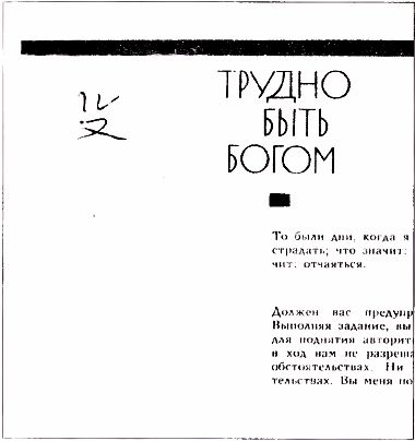 Слово «книгочей» мне всегда казалось придуманным, составленным из двух слов «книга» и «грамотей». Причем пренебрежительное значение второго слова удачно ложилось на значение новообразованного — в книге. Замена в издании ТББ в «Библиотеке современной фантастики» этого слова на «книгочий» повлекла за собой пересмотр словарей, и в результате обнаружилось странное несоответствие. В словаре Даля есть слово «книгочий» с двумя значениями: «любитель чтенья, много читающий» и церковное «книжный, письменный человек, письмовод». В словаре Ожегова есть слово «книгочей» со значением «человек, любящий читать, увлекающийся чтением». В современном словаре русского языка и в словаре Ушакова этого слова ни в том, ни в другом написании нет. Неизвестно, придумали Авторы это слово или взяли его откуда-то, но смысл его в повести отличается от встречающихся. Мало просто читать книги, чтобы быть книгочеем, Кира ведь не книгочей. Ученый, изобретатель, поэт — человек созидающий и глубоко мыслящий — новое значение этого слова, данное Авторами94. Если же говорить об именах и различных названиях в фантастических произведениях, то их появление и употребление в тексте часто весьма любопытны и привлекают исследователей. Выдуманные Стругацкими имена персонажей в ТББ интересны не только привязкой к месту («Румата» — два японских иероглифа) или прототипом (Берия-Рэбия-Рэба), но и лингвистическими вопросами. К примеру, в рукописи и первых изданиях слово «Рэба» не склонялось, позже (может быть, став привычным для Авторов?) стало склоняться. То же произошло у дона Сэры («дона Сэра» в первых изданиях) и брата Абы («брата Аба»). Даже о единице измерения в тексте говорится поначалу как не о децирэбах, а о децирэба. Издателя любое придуманное слово или словосочетание настораживает. Так и хочется заменить незнакомое, непривычное чем-то известным, употребляемым. Так произошло в издании ТББ в «Библиотеке современной фантастики», где в одном месте вместо Арканара стоит Анкара. Так в издании «Миров братьев Стругацких» произошло с действием, отгоняющим нечистого. В ТББ многие жители Арканара для этого ОМАХИВАЮТСЯ большим пальцем. Похоже на «крестятся щепотью», но отличается от привычного и поэтому добавляет колорит. В «Мирах» они ОТМАХИВАЮТСЯ. Можно было бы просто попенять на невнимательность, но... попробуйте отмахнуться большим пальцем... Иногда варианты одного слова ставят не только издателя, но и исследователя в тупик. К примеру, известное стихотворение Гура Сочинителя:Пьеса и киносценарий