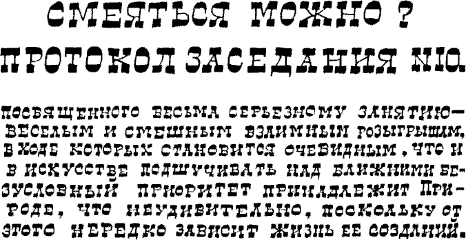 СМЕЯТЬСЯ МОЖНО? Протокол заседания №10, посвященного весьма серьезному занятию — веселым и смешным взаимным розыгрышам, в ходе которых становится очевидным, что и в искусстве подшучивать над ближними безусловный приоритет принадлежит Природе, что неудивительно, поскольку от этого нередко зависит жизнь ее созданий.