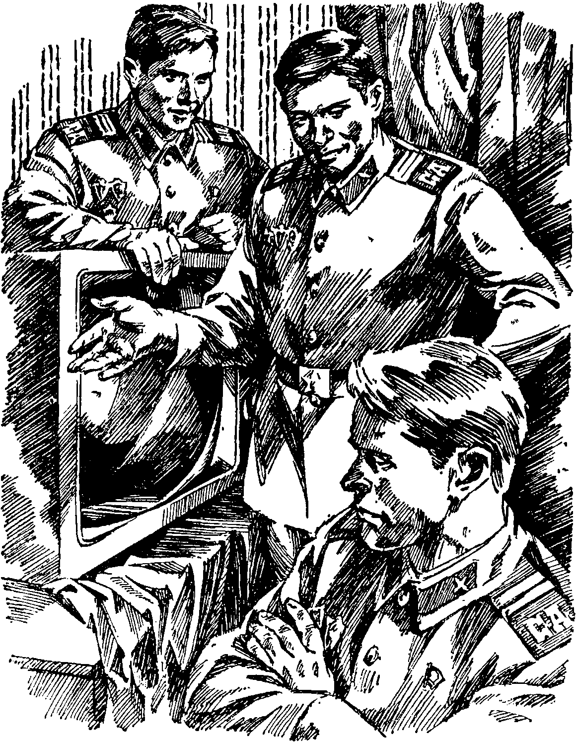 Получен новый приказ: «Всеми силами воспрепятствовать отходу вражеской группировки, отступающей на северо-запад от Варшавы. Уничтожайте переправы, наносите удары по местам скопления…» Высланная авиаразведка подтвердила — большое скопление вражеских сил там, где Висла, обогнув Варшаву, устремила свои воды на север. Смотрю на аэрофотоснимки: лесной массив, прижавшись к реке, образовал большую, покрытую снегом поляну. В лесу, вокруг поляны, в ожидании своей очереди на переправу прячется живая сила и техника врага. — Это и есть наша цель! — говорю командирам полков. — Действуйте без промедления… Опытнейший комэск Михаил Бердашкевич ведет свою группу на выполнение боевого задания. В составе его эскадрильи два неразлучных друга — летчики Андрей Коняхин и Виктор Хухлин. Сегодня у них уже второй вылет — полкам дивизии приказано совершить более двухсот вылетов за час. Коняхин и Хухлин знают, где их будут «приветствовать» зенитки, где могут встретить «мессера», какое скопление войск противника они увидят у переправы через Вислу. — Снять предохранители! Разомкнуться по кругу! — командует ведущий. Эскадрилья с разворота зашла на цель. — Маневр, ребятки! — передал по радио Бердашкевич и устремился на переправу. Первый заход был безрезультатным, на втором бомба ведущего, угодив в переправу, отломила часть понтона. Развернувшись вправо, Коняхин взглянул в сторону своего напарника: самолета Хухлина в поле зрения не было. «Отстал», — подумал Коняхин, высматривая его в воздухе. Каково же было удивление Андрея, когда он увидел самолет друга планирующим на поляну. Поспешно бросив последнюю бомбу, Коняхин вышел из строя и полетел к самолету Хухлина. Не выпуская шасси, самолет друга низко пронесся над землей, увлекая за собой волну снежной пыли, и, скользнув по замерзшей поверхности, остановился. Мотор его парит, винт покосился, крыло покорежено. «Подбит», — решил Коняхин. Энергично переложив самолет с крыла на крыло, чтобы привлечь внимание ведущего, он пошел на снижение. Еще раз взглянул на землю, и сердце его сжалось: к самолету Хухлина со всех сторон бежали немцы. Две пушки и два пулемета Коняхина, захлебываясь, застрочили по полю. На помощь подоспела группа штурмовиков. Построившись в круг, летчики встали на защиту попавшего в беду товарища. Коняхин повел самолет на посадку. «Ил» коснулся снежного покрова неровного поля, подпрыгнул, будто на трамплине, и покатился дальше. Летчик открыл фонарь, высунулся из кабины. Увидев впереди траншею, резко нажал на левый тормоз. Самолет развернулся, завертелся на одной ноге. Фашисты, почуяв двойную добычу, вновь побежали к самолетам. «Возьму на испуг», — решил Андрей и, развернув машину в сторону бежавших, нажал на гашетки. Немцы бросились назад. Коняхин быстро подрулил к самолету Хухлина. — Вылезайте живее! — крикнул он. Пока Хухлин и стрелок выбирались из самолета и поджигали его, группа штурмовиков улетела. Бензин был на исходе, и ведущий больше не мог рисковать. Вновь немцы бросились в атаку. Пули забарабанили по броне. Спасаясь от наседавших автоматчиков, Хухлин со стрелком нырнули в заднюю кабину. Под треск автоматов Коняхин развернулся, дал полный газ. Штурмовик встрепенулся и побежал навстречу высокой стене хвойного леса. В задней кабине теснились трое. Ни в одном бою экипаж не рисковал так, к