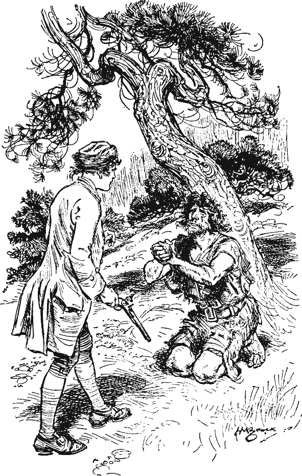С обрывистого каменистого склона посыпался гравий и покатился вниз, шурша и подскакивая между деревьями. Я невольно посмотрел вверх и увидел странное существо, стремительно прыгнувшее за ствол сосны. Что это? Медведь? Человек? Обезьяна? Я успел заметить только что-то темное и косматое и в ужасе остановился. Итак, оба пути отрезаны. Сзади меня стерегут убийцы, впереди — это неведомое чудовище. И сразу же я предпочел известную опасность неизвестной. Даже Сильвер казался мне не таким страшным, как это лесное отродье. Я повернулся и, поминутно оглядываясь, побежал в сторону шлюпок. Чудовище, сделав большой крюк, обогнало меня и оказалось впереди. Я был очень утомлен. Но даже если бы я не чувствовал усталости, я все равно не мог бы состязаться в быстроте с таким проворным врагом. Странное существо перебегало от ствола к стволу со скоростью оленя. Оно двигалось на двух ногах, по-человечески, хотя очень низко пригибалось к земле, чуть ли не складываясь вдвое. Да, то был человек, в этом я больше не мог сомневаться. Я вспомнил все, что слыхал о людоедах, и собирался уже позвать на помощь. Однако мысль о том, что предо мною находится человек, хотя бы и дикий, несколько приободрила меня. И страх мой перед Сильвером сразу ожил. Я остановился, размышляя, как бы ускользнуть от врага. Потом вспомнил, что у меня есть пистолет. Как только я убедился, что я не беззащитен, ко мне вернулось мужество, и я решительно двинулся навстречу островитянину. Он опять спрятался, на этот раз за деревом. Заметив, что я направляюсь к нему, он вышел из засады и сделал было шаг мне навстречу. Потом в нерешительности потоптался на месте, попятился и вдруг, к величайшему моему изумлению и смущению, упал на колени и с мольбой протянул ко мне руки.