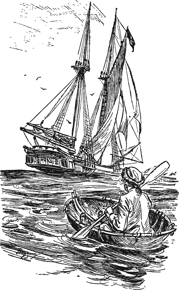 Наконец мне посчастливилось: ветер на несколько мгновений утих. Повинуясь течению, «Испаньола» медленно повернулась вокруг своей оси. Я увидел ее корму. Иллюминатор каюты был открыт. Над столом я увидел горящую лампу, хотя уже давным-давно наступил день. Грот повис, как флаг. Шхуна замедлила ход, так как двигалась лишь по течению. Я несколько отстал от нее, но теперь, удвоив усилия, мог снова догнать ее. Я был от нее уже в каких-нибудь ста ярдах, когда ветер снова надул ее паруса. Она повернула на левый галс и опять, скользя, понеслась по волнам, как ласточка. Сперва я пришел в отчаяние, потом обрадовался. Шхуна описала круг и поплыла прямо на меня. Вот она покрыла половину, потом две трети, потом три четверти расстояния, которое нас разделяло. Я видел, как пенились волны под ее форштевнем[71]. Из моего крохотного челночка она казалась мне громадной. Вдруг я понял, какая опасность мне угрожает. Шхуна быстро приближалась ко мне. Времени для размышления у меня не оставалось. Нужно было попытаться спастись. Я находился на вершине волны, когда нос шхуны прорезал соседнюю. Бушприт навис у меня над головой, я вскочил на ноги и подпрыгнул, погрузив челнок в воду. Рукой я ухватился за утлегарь[72], а нога моя попала между штагом[73] и брасом[74]. Замирая от ужаса, я повис в воздухе. Легкий толчок снизу дал мне понять, что шхуна потопила мой челнок и что уйти с «Испаньолы» мне уже никак невозможно.