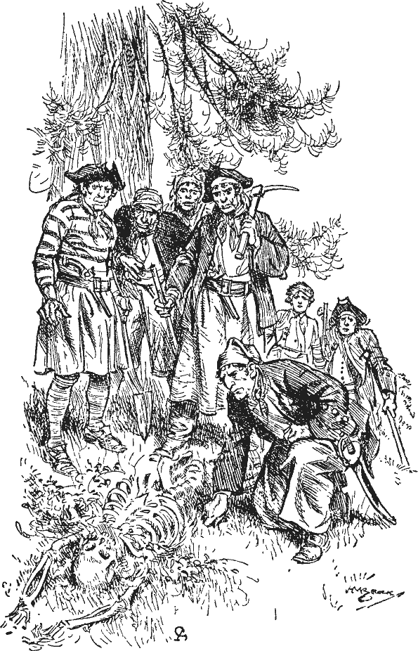 Кажется, с тех пор как стоит мир, не было такого внезапного крушения великих надежд. Все шестеро стояли, как пораженные громом. Сильвер первый пришел в себя. Всей душой стремился он к этим деньгам, и вот в одно мгновение все рухнуло. Однако он не потерял головы, овладел собой и успел изменить план своих будущих действий, прежде чем прочие поняли, какая беда их постигла. — Джим, — прошептал он, — вот возьми и будь наготове. — И сунул мне в руку двуствольный пистолет. В то же время он начал спокойнейшим образом двигаться к северу, так что яма очутилась между нами обоими и пятью разбойниками. Потом Сильвер посмотрел на меня и кивнул, словно говоря: «Положение нелегкое», и я был вполне с ним согласен. Теперь взгляд его снова стал ласков. Меня возмутило такое двуличие. Я не удержался и прошептал: — Так что вы снова изменили своим. Но он ничего не успел мне ответить. Разбойники, крича и ругаясь, прыгали в яму и разгребали ее руками, разбрасывая доски в разные стороны. Морган нашел золотую монету. Он поднял ее, осыпая всех бранью. Монета была в две гинеи. Несколько мгновений переходила она из рук в руки. — Две гинеи! — заревел Мерри, протягивая монету Сильверу. — Это, что ли, твои семьсот тысяч? Ты, кажется, любитель заключать договоры? По-твоему, тебе все всегда удается, деревянная ты голова? — Копайте, копайте, ребята, — сказал Сильвер с холодной насмешкой. — Авось выкопаете два-три земляных ореха. Их так любят свиньи. — Два-три ореха! — в бешенстве взвизгнул Мерри. — Товарищи, вы слышали, что он сказал? Говорю вам: он знал все заранее! Гляньте ему в лицо, там это ясно написано. — Эх, Мерри! — заметил Сильвер. — Ты, кажется, снова намерен пролезть в капитаны? Ты, я вижу, напористый малый. На этот раз решительно все были на стороне Мерри. Разбойники стали вылезать из ямы, с бешенством глядя на нас. Впрочем, на наше счастье, все они очутились на противоположной стороне. Так стояли мы, двое против пятерых, и нас разделяла яма. Ни одна из сторон не решалась нанести первый удар. Сильвер стоял неподвижно. Хладнокровный и спокойный, он наблюдал за врагами, опираясь на свой костыль. Он действительно был смелый человек.