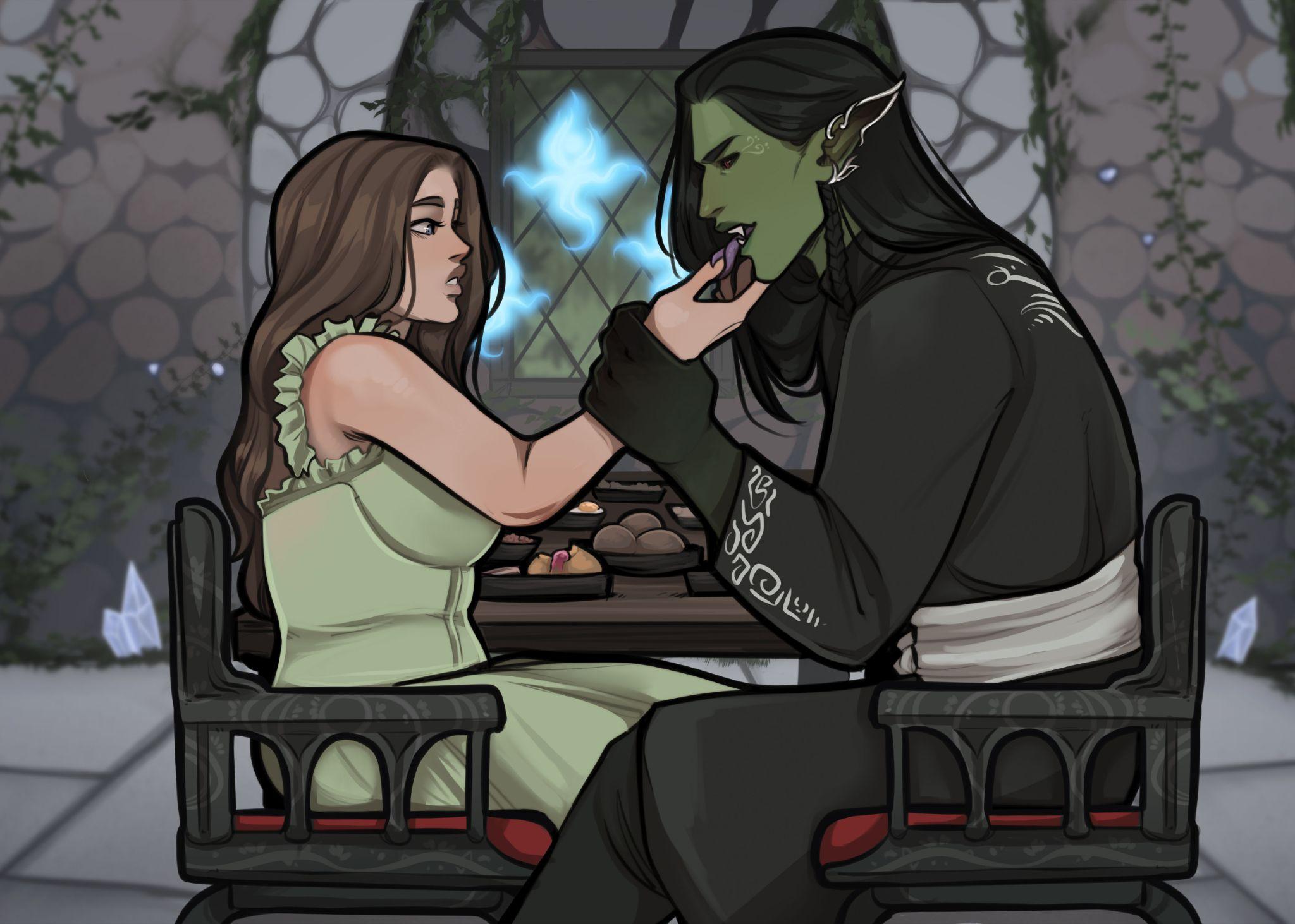Подойдя к ложу, он опустился на колени и усадил ее на него. Мягкие папоротники прогнулись под весом Кинсли. Она улыбнулась ему, когда он отодвинулся и сел на корточки, сложив крылья за спиной. Теплый ветерок развевал пряди его волос, и когда Кинсли вгляделась в его царственные черты, она снова вспомнила о том, каким неземным он был. Каким потрясающе красивым он был.