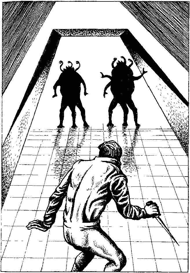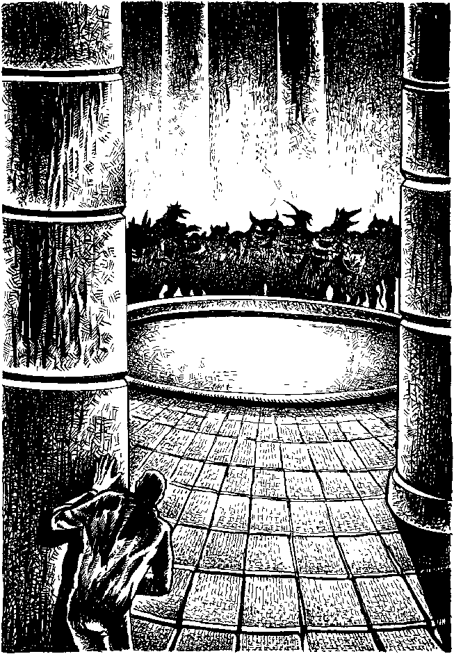 Билл достал сигареты, и они закурили. Потом, с револьверами в свободно опущенных руках, медленно пошли через огромную арену. Ряды на трибунах были переполнены людьми. С трибун доносился рев. Они узнали его. Это был рев толпы, собравшейся в ожидании битвы и требовавшей крови. — Обычное сборище футбольных болельщиков, — усмехнулся Карл. Трибуны принимали все прибывающие толпы, но было очевидно, что собравшиеся все вместе обитатели руин смогут заполнить лишь малую часть тысяч сидений. Казалось, путешественники затерялись в этом огромном пространстве. Почти в зените, прямо над головами, висело огромное красное солнце. Словно они шли по освещаемой закатом пустыне, обрамленной чудовищными белыми утесами. — Должно быть, когда строили эту штуку, Денвер был огромным городом, — заметил Билл. — Представь себе, сколько народу она может вместить. Интересно, для чего это предназначалось? — Наверное, мы никогда не узнаем об этом, — ответил Карл. Они дошли до центра арены. Карл остановился. — Ты знаешь, — проговорил он, — я тут поразмыслил немного. У нас неплохие шансы против Голан-Керта. За последние пятнадцать минут каждая наша мысль содержала открытое презрение к нему, но он ничего не предпринял, чтобы уничтожить нас. Хотя, возможно, он просто выжидает. Я начинаю верить в то, что он не может читать наши мысли, как это было со стариком. Он убил его в тот момент, когда были произнесены слова предательства. Билл кивнул. И как бы в ответ на слова Карла сверху навалилась огромная тяжесть. Билл ощутил, как по его телу расползается беспощадная боль, слабнут колени, закружилась голова. Перед глазами закружили разноцветные пятна, ужасная боль скрутила живот. Он сделал шаг и споткнулся. Чья-то рука вцепилась в его плечо, с силой его встряхнула. От сотрясения его рассудок мгновенно просветлел. Туман, застилавший его глаза, стал рассеиваться, и сквозь него Билл увидел бледное, перекошенное лицо друга. Губы на лице шевелились. — Взбодрись старина, с тобой все в порядке. У тебя прекрасное самочувствие. Словно что-то сломалось в его голове. Это было внушение, внушение Голан-Керта, и он победил его. Билл твердо уперся ногами в песок, с усилием расправил плечи и улыбнулся: — Нет, черт возьми, со мной все в порядке, и у меня прекрасное самочувствие. Карл ударил его по спине. — Это призрак, — прорычал он. — Минуту назад он чуть не свалил меня с ног. Но мы должны побить его, парень, мы его просто должны побить! Билл хрипло рассмеялся. Голова его была чиста, сила снова возвращалась в тело. Первый раунд был выигран! — Но где же этот Голан-Керт?! — выпалил он. — Он невидим, — прорычал Карл. — Но у меня есть мысль, что в этом состоянии он не может показать все, на что он способен. Мы заставим его показаться, а потом зададим ему работенку. Холодящий душу рев толпы донесся до них. Трибуны видели и по достоинству оценили маленькую драму, разыгравшуюся посреди арены. Они просили большего. Внезапно позади их раздался яростный перестук. Они вздрогнули. Это было знакомое «тра-та-та» пулемета. Они без колебания упали плашмя, прижавшись к поверхности, стараясь зарыться в песок. Кругом их взлетали маленькие фонтанчики песка. Билл почувствовал обжигающую боль в руке. Пуля настигла его. Это был конец. На широком пространстве арены невозможно было укрыться от огня бьющего по ним сзади пулемета. Жг