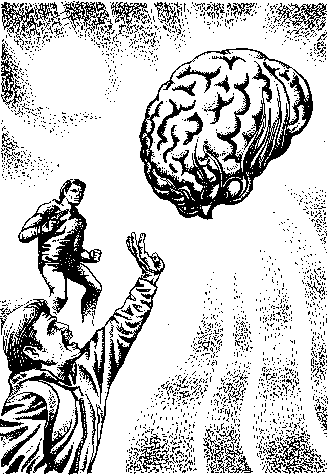 Гигантский мозг, около двух футов в диаметре, без всякой видимой поддержки висел в воздухе. Голый, изборожденный извилинами, отвратительный мозг. Отвращение усиливалось из-за двух маленьких, как у свиньи, лишенных ресниц близко посаженных глаз и изогнутого клюва, который начинался прямо под передней частью мозга; и основывался на том, что, вероятно, было атрофировавшимся лицом. Оба путешественника были поражены ужасом, но громадным усилием воли сохраняли самообладание. — Здорово, Голан-Керт, — язвительно процедил Карл. Одновременно его рука взметнулась вверх, и курок револьвера под давлением пальца медленно отошел назад. Но прежде чем он смог совместить мушку револьвера с гигантским мозгом, его рука замерла, и Карл застыл, как замороженный, скован ужасной силой, исторгнутой Голан-Кертом. Рука Билла взметнулась вверх, и его «сорок пятый» сердитым грохотом взорвал тишину. Однако во время выстрела его рука отлетела в сторону, словно по ней был нанесен сильный удар, и пуля на ничтожную часть дюйма ушла в сторону от огромного мозга. — Самонадеянные глупцы! — прогремел голос, который, однако, в действительности голосом не был, так как отсутствовал звук; просто возникло чувство, что они слышат это. Двое, замершие, будто во внимании, поняли, что это телепатия: мозг, находящийся перед ними, испускал мощное излучение. — Самонадеянные глупцы, вы хотите побить меня, Голан-Керта? Меня, чья мыслительная мощь в сотни раз превышает способности вех ваших вместе взятых умов? Меня, чьи познания беспредельны во времени? — Мы побьем тебя! — рявкнул Карл. — Сейчас мы тебя побьем. Мы знаем, кто ты такой. Ты не из Космоса. Тебя породили в одной из лабораторий. Неизвестно, какое количество лет ты развивался в искусственных условиях. Ты не бессмертен. Нашего оружия ты испугался. Пуля, попавшая в мозг, покончит с тобой.