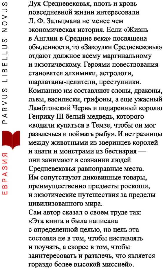 Льюис Френсис Зальцман внес безусловный вклад в формирование экономической истории Англии средневекового периода. По словам самого автора, «эта книга и была написана с определенной целью, но цель эта состояла не в том, чтобы наставлять и поучать, а скорее в том, чтобы заинтересовать и развлечь, что является гораздо более высокой миссией». С присущим ему высокопробным английским юмором, он предваряет эту сентенцию указанием на крайне увлекательный характер его основных исторических штудий. Можем только догадываться, насколько интересными были эти занятия, Зальцман же знал о них не понаслышке, что и вынуждало его пару раз совершать разворот в сторону «более высокой миссии». Три тропинки были выбраны автором для того, чтобы выбежать за рамки опостылевшей обыденности и однообразия: диковинки и экзотические товары, преимущественно предметы роскоши, попадавшие в Англию; далекие путешествия за границы европейского универсума; и вторжение бестиарно-геральдических монстров и чудовищ. Завороженному автору музыкой звучат названия восточных тканей, и в унисон он сам замечает, что никогда не знал и не хотел узнать, что за дерево — альмуг. Так и не разобрался: дамаск, дамаскин, дамаскет — они ведь разные, названия отсылают к общему для всех месту происхождения — сирийскому Дамаску. Ткали ткань в Дамаске, много позже и в Европе, но шелк, как известно, привозили из Китая. А то, что ткань была изготовлена на льняной, хлопчатой, шелковой основе; могла быть с вплетением золотых нитей, а могла без оных, то, что узор на ней был выткан, а не нанесен поверх, осталось за рамками повествования. Равно как и то, что сама по себе бестиарная традиция достаточно четко распадается на два этапа, два разных набора бестий, из общего имеющих только названия: античную и средневековую. А уж геральдические звери — они и вовсе третий набор удивительного в этом списке, вполне отдельный от первых двух. Кому интересно узнать об этой теме подробнее, могу порекомендовать прочитать две очаровательных книги, вышедшие в серии Parvus Libellus ранее: «Василиск античных врачей и магов» и «Василиск: алхимическая мутация», обе одного автора — А. Г. Юрченко. Все гораздо хуже с путешествиями, ибо «количество тех, кто проникал еще дальше на таинственный Восток, было невелико». И забавно, как в глазах автора достоверность сведений сэра Джеффри Ленгли подтверждается сообщениями Гонсалеса де Клавихо. Действительно, не привлекать же местные источники, их ведь писали не англичане и даже не европейцы. По необходимости, позволим себе пространную цитату: «К концу XII века татары, кочевое племя, населявшее регион между Кавказом и Евфратом и исповедовавшее несторианство, приобрели известность в Европе благодаря популярности своего хана, знаменитого пресвитера Иоанна. Однако в 1203 году он был убит ужасным Чингисханом — Моголом из Туркестана, чьи преемники через одно или два поколения переняли этноним и религию покоренных татар. Аргон, царь татар, принял христианство в 1289 году и в союзе с царями Армении и Грузии нанес тяжелое поражение силам султана. Позже, в том же году, его послы прибыли в Европу, получив задание проповедовать новый крестовый поход за изгнание сарацинов из Палестины. Подкрепленные благодарственными письмами папы, они посетили английский двор. Король Эдуард принял их и написал А