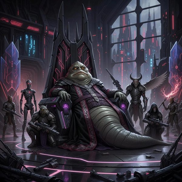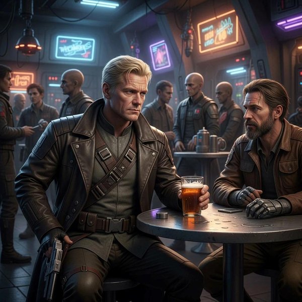 Кантина была типичной для Нар-Шадаа — полутемной, дымной, с музыкой, которая заглушала разговоры. Воздух был пропитан запахом алкоголя, табака и чего-то более экзотического. За столиками сидели представители дюжины рас, обсуждая дела на своих языках. В углах прятались фигуры в капюшонах, а у стойки бара открыто демонстрировали оружие наемники.