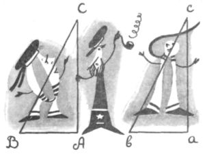 — Внимание! — сказал капитан. — Фрегат идёт вдоль берега Точных Доказательств. Здесь надо вести судно особенно осторожно: повсюду подстерегают подводные камни. Один неумелый манёвр — и можно утонуть в море Ошибок. Вот герб берега Точных Доказательств. Капитан протянул нам памятный значок. На одной его стороне было написано: «Меньше слов — больше смысла», а на обороте — «Требуйте точных и красивых доказательств!» Да, это вам не бухта Аксиома, где ничего нельзя доказывать! Здесь не только можно, но и нужно. Но капитан сказал, чтобы я не слишком торопился отделаться от аксиомы. Потому что без аксиомы ничегошеньки не докажешь. Ни одной теоремы! — Чего-чего? — переспросил я. — Те-о-ре-мы! — повторил капитан. — Это слово греческое и означает в переводе «обдумывание». Для того чтобы доказать теорему, надо много думать. Я сказал, что, наверное, очень трудно доказывать теоремы. Но капитан ответил, что совсем не трудно, если всё время думать логически, то есть рассуждать правильно, последовательно, так, чтобы одна мысль вытекала из другой, а не противоречила ей. Уметь логически рассуждать важно каждому, а математику — особенно. Я попросил капитана доказать какую-нибудь теорему. Он нарисовал два треугольника, оба прямоугольные, — я это понял сразу, потому что не успел ещё забыть легенду про маму-Гипотенузу и братьев-Катетов. Капитан велел запомнить, что точки, где сходятся стороны треугольника, называются вершинами и что вершин у треугольника три. Он их обозначил латинскими буквами. У одного треугольника — большими (А, В, С), у второго — маленькими (а, b, с). — Эти треугольники замечательны тем, — продолжал капитан, — что как меньшие, так и большие катеты у обоих одинаковой длины. Вот и надо доказать, что при этом треугольники равны между собой. Я чуть было не брякнул, что это очень просто, но капитан остановил меня. — Первым делом, — сказал он, — надо определить, что такое равные треугольники. Ведь прежде чем что-либо доказывать, надо знать, что собираешься доказать. Так вот. Если ты возьмёшь два треугольника, наложишь их аккуратно один на другой и они в точности совпадут, то такие треугольники и называются равными. Я тут же решил вырезать один из нарисованных треугольников, а потом наложить его на другой, но капитан сказал, что это будет не доказательство теоремы, а кит знает что. Во-первых, нам может только показаться, что треугольники совпали, потому что зрение наше несовершенно. Но если даже треугольники совпадут в точности, мы докажем лишь то, что равны только эти треугольники. А теорема должна быть справедливой не для двух, а для всех прямоугольных треугольников, у которых катеты соответственно равны. — А для этого, друзья, — закончил капитан, — нужно уметь рассуждать. Думать надо, думать! Ничего не поделаешь, придётся немножко и подумать. — Начнём доказательство со слов: «Допустим, что…», — сказал капитан. — Допустим, что я мысленно (обратите внимание — мысленно!) накладываю вершину прямого угла одного треугольника на вершину прямого угла второго — точку А на точку а. А потом осторожно накладываю друг на друга два равных катета. Как вы думаете, совпадут концы этих катетов или нет? Совпадут точки В и в? — Совпадут, — ответил Пи, — ведь катеты эти одинаковой длины. — Верно. Теперь допустим, что эти катеты крепко-накрепко склеились. Наложатся друг н