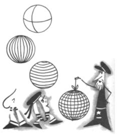 — Ты не подумал о том, что каждый меридиан пересекает экватор в двух точках, — объяснил капитан. — Уразумел? Тогда пойдём дальше. Покончив с экватором, стали делить меридиан. Расстояние по меридиану между экватором и каждым полюсом разделили на 90 равных частей и провели параллельные экватору окружности, которые получили название параллелей.