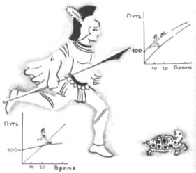 Если отрезок в 100 метров Ахиллес пробегает, скажем, за 10 секунд, то за 20 секунд он пробежит вдвое больше — целых 200 метров. Черепаха же за 20 секунд одолеет только 20 метров и останется на целых 80 метров позади Ахиллеса.