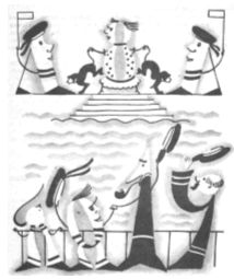 Фрегат остановился. Спустили трап прямо в море. Нептун величественно проследовал на палубу. Команда выстроилась перед ним в полном параде, и он каждому пожал руку. Но когда очередь дошла до меня и до кока, Нептун неожиданно подхватил нас и швырнул прямо в море! Мы заорали не своим голосом, но нас быстро выловили и водворили на судно под всеобщий смех и ликование. Мы стояли мокрые, взъерошенные, злые. Но Нептун словно и не замечал этого. Он крепко расцеловал нас и поздравил с посвящением в моряки.