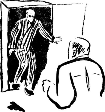 В фирме «Краузе и Смит» ожидали всего. Но когда подкупленный служащий фирмы «Пратт» сообщил, что все изобретения исходят из лаборатории Альвы Доумана, что они шифруются буквами «В» и «К» и порядковыми номерами, что авторская часть вознаграждения выплачивается семьям Венстена и Крюгана, даже самых больших скептиков охватил суеверный ужас. Венстен и Крюган были инженерами электронно-исследовательской лаборатории фирмы Пратт». Первый из них умер в прошлом году, второй — пять лет назад. Оба они завещали свои трупы Альве Доуману для каких-то опытов. Только благодаря выдающемуся уму Венстена «Пратт» процветала. Он не только сыпал изобретениями, словно из рога изобилия, но умел применять их наиболее экономично. К тому же Венстен нередко советовал директорам фирмы, как и когда применять изобретения с наибольшей выгодой. Но в то же время он отказался от предложения стать совладельцем фирмы. Огромные деньги, стекавшиеся в его руки, он расходовал самым неожиданным и нелепым образом. Он был составлен из противоречий, как из разноцветной мозаики. Владельцам и директорам конкурирующей фирмы «Краузе и Смит» оставалось кусать локти. Никакие их уоилмя не могли задержать разрастания «Пратт», хотя у нее было меньше капитала и возможностей. Лишь смерть Венстена давала им надежду на изменение положения. Но в новом деле, где старый Краузе готов был поручиться, что заказы на оборудование достанутся ему, их вновь перехватила фирма «Пратт». И каким образом? Типично венстеновским приемом. В последний момент, когда противник был убежден в победе и ослабил усилия, «Пратт» сообщила о крупном изобретении, разрешавшем выпускать реле с удвоенным сроком службы. Даже в том, как описывалось открытие, как подчеркивалось его экономическое значение, виден был «почерк» Венстена. Если бы люди, хорошо знавшие инженера, не были уверены в его смерти, они бы определили, что м изобретение совершено, и описание составлено, и момент для сообщения выбран Венстеном. Один за другим ни с чем возвращались агенты, в лабораторию лысого «безумца» никто из них He пробрался. Старый Краузе рвал на мелкие клочки ненужные бумажки — а это был плохой признак. Когда было получено сообщение от служащего «Пратт», Краузе прервал совещание директоров и знаком велел остаться Конраду Дорту, одному из совладельцев фирмы. — Вы знали всех этих… — «большой старик» сделал неопределенный жест. — Вам придется взять дело на себя. Он пожевал губами и умолк. Это было равносильно приказу. …Конраду пришлось немало потрудиться. Лучшие детективы ничего не смогли сделать. Оставалось надеяться только на себя самого. Две с половиной недели, пять неудачных попыток — и наконец он в этом проклятом шкафу в лаборатории Альвы. Конрад ждет. Сквозь щель в двери пробивается узкая полоска света, острая, как лезвие бритвы. У Конрада затекла левая нога. Он повернулся, и дверца шкафа скрипнула, Конрад потянул дверь к себе cлишком сильно. Полоска света исчезла. Теперь нужно снова осторожно приоткрыть дверь. Но тут послышались тяжелые шаги нескольких человек. В лабораторию что-то внесли. Прозвучал быстрый захлебывающийся голос Альвы — его Конрад различил бы даже в шуме толпы: — Ставьте здесь и здесь. Шаги удалились, потом стали приближаться. Но это уже были шаги одного человека, Альвы. Быстрый голос и шаркающие шаги, ме