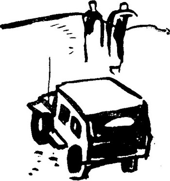 Странное здание — навес с вращавшимся зеркалом — было уже совсем близко. Оно хорошо просматривалось сквозь фиолетово-кровавый туман. И вот тогда-то из здания и появились эти фигуры. Они построились полукругом и застыли, чуть раскачиваясь иэ стороны в сторону. Трудно сказать, на что они похожи. Кубы, переходящие в конусы, а над ними вспыхивают маленькие зеленые молнии, и куб постепенно превращается в шар. Но и конусы меняют свою форму, иногда обволакиваются дымкой и мерцают, покрываясь волнами, иногда совсем… исчезают, и остаются только колеблющиеся волны. — Жители этой планеты?.. — прошептал Вадим, самый молодой из космонавтов. — Машины или аппараты? — отозвался Ким, и ему стало душно под пластмассовым скафандром. Непонятные существа или аппараты приблизились. Теперь их отделял от землян лишь ручей бурлившей, фиолетово-алой жидкости. Почти одновременно все четверо землян почувствовали покалывание в висках и затылке, как бы действие слабого электрического тока. Пйкалывания повторялась в определенном ритме, нарастали… — Они начали передачу, — сказал космонавт, которого все называли Водителем, и подумал; Это или мыслящие существа, или управляемые машины. Нам надо договориться с ними или с теми, кто их послал. И прежде всего показать, кто мы такие…» Он несколько раз взмахнул руками, повторяя одни и те же знаки, как при сигнализации на морских кораблях; Он долго проделывал это, выполняя программу А-2», пока не услышал голос своего помощника Роберта, которого на земле уже дважды считали погибшим. — Они не понимают. Может быть, у них нет зрения? Водитель включил микрофон. Теперь все, что он говорил, раздавалось из небольшого репродуктора на шлеме. Он произносил несколько фраз с определенным чередованием звуков, повторял их, потом говорил другие фразы и снова повторял их. Конусы молчаливо покачивались на другом берегу ручья… — У них может не оказаться органов слуха, — сказал Ким и подумал: «Если, например, они ощущают мир как гаммы излучений, то могут принять нас за неизвестных животных или за машины своих врагов. Возможно даже, что мы чем-то опасны для них. Какие-нибудь наши биоволны вредно действуют на них. Тогда они захотят уничтожить нас. Как же показать им, кто мы такие?» Он попробовал послать радиосигналы, но странные существа не отвечали. Может быть, они не принимали волн такой длины. «Они или те, кто их послал, могут познавать мир и общаться с помощью органов, которых у нас нет, например химических анализаторов или же уловителей кагоих-то особых волн, — напряженно соображал Роберт, — Но как бы то ни было, они должны убедиться, что мы способны изменять мир. Тогда они поймут, что мы не животные». Он посоветовался с другими и вытянул руку с пистолетом в направлении темной скалы- Узкий пучок ослепительно белых лучей вырвался из ствола пистолета — и скала превратилась в облако пара. В то же мгновение руки землян словно окаменели; с трудом можно было сжать и разжать пальцы. Покалывания в висках стали болезненными. «Это их реакция, — понял Водитель. — Они принимают меры, чтобы мы не могли причинить им вреда». — Неразумный поступок,- резко сказал Ким. — А если эта скала — их памятник? — Мы ничего не доказали. Здесь могут водиться животные с реактивными органами. Кроме того, то же самое способны проделать машины, — высказал свое предположение 