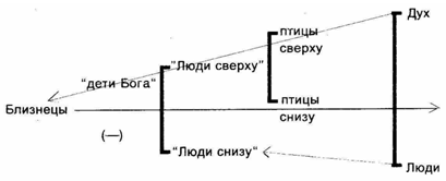 Отношение, устанавливаемое таким образом между близнецами и птицами, не объясняется ни принципом сопричастия на манер Леви-Брюля", ни утилитарными соображениями, как те, что упоминаются Малиновским, ни интуицией чувственного сходства, допускаемой Фиртом и Фортесом. Мы присутствуем при серии логических сцеплений, соединяющих ментальные отношения. Близнецы "суть птицы" не потому, что они с ними смешиваются или им подобны, а потому, что относятся к другим людям, как "люди сверху" к "людям снизу", и среди птиц выступают, как "птицы снизу" по отношению к "птицам сверху". Итак, как птицы они занимают промежуточное положение между верховным духом и людьми.