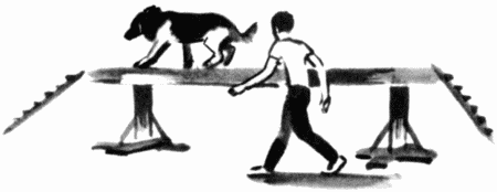 Нужно еще заметить, что не все породы одинаково легко и быстро одолевают снаряды. Например, боксерам, как правило, все снаряды даются легко — прыгают они как мячики, по буму ходят чуть ли не с первого раза, лестницу постигают тоже сравнительно просто. Эрдели виртуозно ходят по пожарной лестнице и буму. А вот колли или грузной овчарке очень трудно научиться ходить по буму и лестнице. Все собаки грузной и сырой конструкции тяжело преодолевают препятствия, независимо от породы. К этим собакам особенно нужен индивидуальный подход — не спеша и осторожно приучать их прыгать, лазать по лестнице и ходить по буму. Они больше других собак нуждаются в страховке.