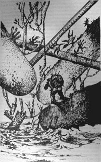 Но день прошел все-таки не зря. Он выучил более двадцати слов, просмотрел книги и множество картинок, которые нарисовала Марсия, и сделал еще одно небольшое открытие — то, во что он спрыгнул с трубы, и в чем едва не утонул, было… супом. Субстанция, в которую были высажены молодые цимбреллы, была зооглоком — клейкой кашей из простейших растений и примитивных животных форм, питающихся этими растениями. Тепло от множества живых организмов, поглощающих воду, удерживало садовую грязь в полужидком состоянии и предохраняло нежные ростки цимбрелл от замерзания зимними морозными ночами, когда температура опускалась до минус сорока градусов по Фаренгейту. Подросшие деревца пересаживались на трубу вместо погибших, а зооглок возвращался в канал трубы, где его частично съедали, частично фильтровали реактивные рыбы, перекачивающие воду из полярных широт в экваториальные.