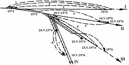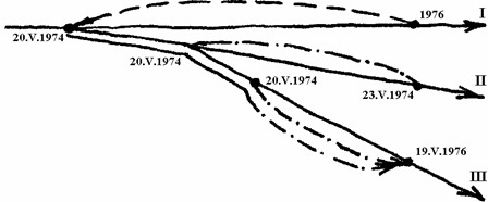 Сейчас я тебе объясню, дорогой ты мой! Поправлю я твой рисунок! Теперь для меня все это — задачки для первого класса. Вчера еще я бился в путанице мировых линий, как муха в паутине, а сейчас все эти переплеты и перекрестки вижу вполне отчетливо. Я взял прутик и наклонился над схемой, чувствуя на себе напряженный взгляд Аркадия. Прежде всего нужно было убрать нелепый пунктир, соединявший сразу две линии. Дело обстояло вовсе не так, теперь я это понимал. «Аркадий-путешественник» вечером двадцатого мая 1974 года прибыл в наш институт из 1976 года — это во-первых. Его пребывание у нас породило новую мировую линию, ту самую, что на рисунке помечена цифрой II, — это во-вторых. И вот, пока он находился на линии II, беседуя с «тамошним» Аркадием, в ту же точку, в двадцатое мая, прибыл я. Это и было то третье, чего не понимал Аркадий! Ну что ж… покажем свой переход пунктиром с точками, в отличие от путешествия Аркадия… Вот так! Стартовал я двадцать третьего мая семьдесят четвертого года и находился в тот момент на линии II. Прибыл на ту же линию, но на более раннюю точку — в двадцатое мая, того же года разумеется. И начал метаться по институту как ошпаренный: таинственного «незнакомца» выслеживал, Аркадия хотел уберечь… попутно таблетки уволок — и, естественно, повлиял этим на все последующие события… Проще говоря, взял и сотворил мировую линию с порядковым номером III и измененным ходом событий. Например, на линии II смерть Аркадия Левицкого является непреложным фактом. Отметим ее, кстати, крестиком… А на линии III такого крестика не будет, потому что там Аркадий благополучно существует поныне. И, вероятней всего, это именно он сейчас с интересом присматривается к тому, что я вычерчиваю на песке… Теперь надо объяснить этому Аркадию — присутствующему здесь Аркадию, кем бы он ни был, — что «Аркадий-путешественник» стартовал уже не со второй, а с третьей линии. Ведь он был в институте вечером двадцатого мая, когда я появился там, горя желанием все понять и все исправить, и немедленно перевел эту дружную пару Аркадиев на другие рельсы! Покажем ему эту пару Аркадиев вот такой двойной линией от момента их встречи до моего появления. Затем мы эту двойную линию поломаем в том месте, где я прибыл в прошлое и начал творить всякие чудеса местного значения, вот так… и протянем мы ее до драматической разлуки двойников в зале хронокамер… Расставим повсюду даты, чтобы он все до конца понял. Ну, а теперь покажем ему пунктиром, как «Аркадий-путешественник» совершил переход из зала хронокамер во вчерашний здешний вечер, на два года вперед, и тут же прочертим пунктиром мой переход вслед за ним… Все!