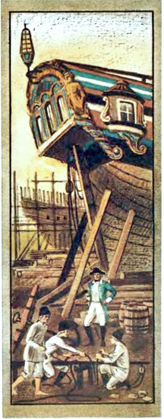 Высоко в небо уходят корабельные мачты из лучших, отборных сосен. Поперечины — реи поднимают вверх пеньковые просмолённые снасти, на них натягивает ветер громадные белые полотнища парусов. «Трёк! Трёк!» — раздаётся дружный выкрик матросов, когда они натягивают снасти или убирают паруса. И боцманы тоже тут как тут, в руках линьки — короткие верёвки с узлом на конце. Эти не зевают, чуть кто приотстал — хлестнут линьком вдоль спины, матрос и не охнет. Дело суровое, море шуток не любит.