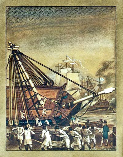 С треском проламывали древесину, прорывали паруса. Лопнувшие снасти, как змеи, извивались по палубе. Но не останавливались ни на мгновение в страшной своей работе артиллеристы «Евстафия». Без передыху, без глотка воздуха в смраде и чёрном пороховом дыму заряжали они огромные пушки с клеймами оружейного завода далёкой Тулы, наводили прицелы, подносили пальник — и успевали отскочить, когда, изрыгнув ядро, пушка отпрыгивала назад, как живая, на всю длину сдерживавших её цепей…
