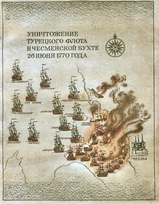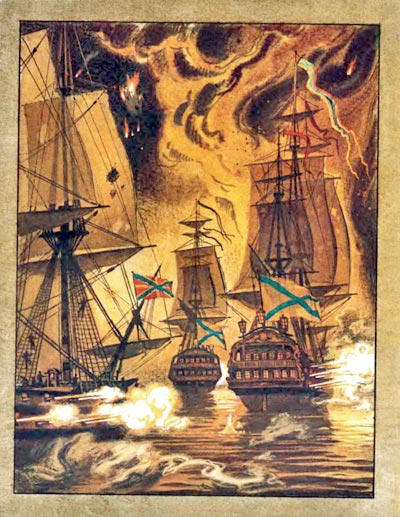 На рассвете 24 июня наша эскадра выстроилась в линию и при попутном ветре двинулась на турецкий флот. Корабли шли вперёд медленно и плавно. Ветром наполнены белые паруса, натянуты снасти, всяк стоит на своём месте, и только вдоль бортов вьются белёсые струйки дыма от пальников, зажжённых на пушечных палубах. Тихо-тихо. Лишь чуть поплёскивает вода под бортами да слышно, как хлопают над головой флаги. И медленно-медленно, словно из-под земли выворачиваясь, вырастают перед глазами громадины вражьих кораблей…
