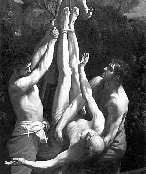 Марк, или, точнее, Мáркус (Marcus), именуемый также Иоанном,[29] по преданию, был сыном Марии, имевшей дом в Иерусалиме, в котором часто бывал апостол Петр (Деян.12:12–17). Автор Первого послания Петра утверждает, что апостол якобы даже называл Марка «сыном» (1 Петр.5:13). По происхождению Иоанн был евреем, «из обрезанных» (Кол.4:10–11). Кроме того, Марк был близким родственником Варнавы[30] (Кол.4:10), того самого эллиниста с Кипра (Деян.4:36), который вместе с апостолом Павлом совершил несколько миссионерских путешествий, и Марк сопровождал их обоих в путешествиях на Кипр и в Малую Азию, где и поссорился с Павлом (Деян.12:25; 13:5,13; 15:37–39). Спустя около десяти лет, уже при Нероне, Марк в Риме (Кол.4:10; ср. 2 Тим.4:11) встретил апостола Петра (1 Петр.5:13) и стал его учеником и переводчиком (μαθητὴς καὶ ἑρμηνευτής) (Iren.Haer.III.1:2{1:1}; Eus.HE.V.8:3),[31] так как Петр, вероятно, не знал никакого другого языка, кроме арамейского (Eusebius. Demonstratio evangelica.III.5,7). Но апостола в Риме распяли — распяли вниз головой, ибо Петр счел себя недостойным умереть так же, как Учитель (Martyrium Petri et Pauli.60; Eus.HE.III.1:2; Demonstratio evangelica.III.5; ср. Ин.21:18–19; Hier.De viris ill.1).[32] Существует также предание, что Марк впоследствии стал епископом в Аполлониаде.[33] Согласно другой версии, он после смерти Петра отправился из Рима в Египет и, проповедуя христианство в Александрии, основал церковь (Hier.De viris ill.8). По утверждению Евсевия (Eus.HE.II.24) и Иеронима (Hier.De viris ill.8), умер Марк «на восьмом году царствования Нерона», т. е. в 61 или 62 году. Вот, в принципе, и все, что известно об Иоанне-Марке из церковного предания.Гвидо Рени (1575–1642) Распятие святого Петра (Музей Ватикана)