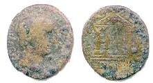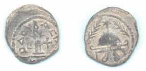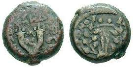 Монета Ирода. Бронза. 23 мм. Аверс: треножник и греческая монограмма. Реверс: шлем и звезда среди двух пальмовых ветвей.