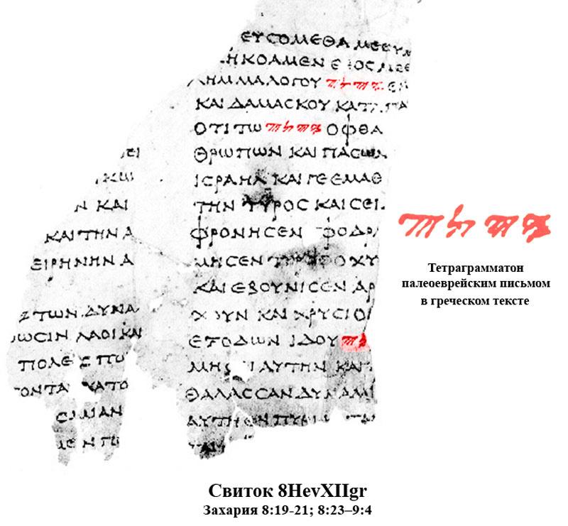 13 Discoveries in the Judaean Desert VIII: The Greek Minor Prophets Scroll from Naḥal Ḥever (8HevXIIgr). Edited by E. Tov. Oxford: Clarendon Press, 1990; Waddell W. G. The Tetragrammaton in the LXX. // Journal of Theological Studies 45. Oxford, 1944. P. 158–161. О Тетраграмматоне см. также: Driver S. R. Recent Theories on the Origin and Nature of the Tetragrammaton. // Studia Biblica. Vol. 1. Oxford: Clarendon Press, 1885. P. 1–20; Spoer H. H. The Origin and Interpretation of the Tetragrammaton. Chicago: Chicago University Press, 1901; Архимандрит Феофан. Тетраграмма, или Ветхозаветное Божественное Имя YHWH. — СПб., 1905. В последней книге вы также найдете обширную библиографию по данному вопросу.(обратно)