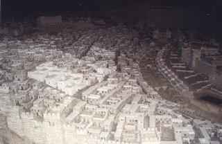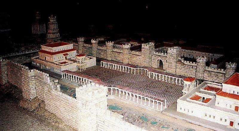Иерусалим — по-еврейски: Й’ру-ша-лá-йим (יְרוּשָׁלַיִם); по-арамейски: Й’ру-ш’лéм (יְרוּשְׁלֵם) — в переводе на русский язык означает город мира, город согласия. Впервые этот город упоминается в табличках Тель-эль-Амарны (XIV в. до н. э.) под названием Уру-Салиму. После вавилонского плена он оставался центром, столицей иудейства, и вместе с иудейством рос и развивался Святой город — Ир hаккóдэш (עִיר־הַקּדֶשׁ). Иосиф Флавий пишет: «Число всех пленных за время {Иудейской} войны доходило до девяноста семи тысяч, а павших во время осады {Иерусалима} было миллион сто тысяч. Большинство их было родом из Иерусалима; ибо со всей страны стекался народ в столицу к празднику опресников и здесь был неожиданно застигнут войной {…}. А что город мог вмещать такую массу людей, явствует из переписи при Цестии. Последний, чтобы показать Нерону, считавшему иудейский народ совсем малозначащим, как велика степень процветания города, поручил первосвященнику по возможности привести в известность численность населения. Так как тогда наступал праздник Пасхи, когда от 9 до 11 часа приносят жертвы, а вокруг каждой жертвы собирается общество из девяти человек по меньшей мере, но часто и из двадцати (ибо одному нельзя поедать эту жертву), так сосчитали жертвы, и их оказалось 256 500. Если положим на каждую жертву только по десяти участников, то получим 2 700 000 — и то исключительно чистых и освященных, ибо прокаженные, одержимые семятечением, женщины, находившиеся в период месячного очищения, и вообще нечистые не допускались к участию в этой жертве, равно как и являвшиеся для поклонения неиудеи» (Jos.BJ.VI.9:3). Похоже, эту же историю имеет в виду Тосефта (Тосефта. Песахим.4:3), сообщая также, что Храмовая гора не могла вместить всех, причем Талмуд уточняет, что была давка (Вав Талм. Песахим.64б), а потому Пэсах был назван Пэсахом Раздавленных (פסח מעוכין). Однако точность сообщаемых здесь данных подлежит сомнению. Город с пространством в 33 стадии, как его определяет сам Иосиф, едва ли мог вмещать в себе такую массу людей. С другой же стороны, заклание такого огромного числа пасхальных жертв в сравнительно незначительном по пространству храмовом дворе в течение двух часов оказывается абсолютно невозможным.[196] Тацит приводит несравненно меньшее число: осажденные обоего пола и всех возрастов составляли все вместе 600 000 человек (Tac.H.V.13). Так как в Иерусалиме заперлось множество людей, обыкновенно живших вне столицы, то можно определить среднее число его жителей в 300 000 человек. Если его определить к 30 году н. э. даже в 200 000, то для того времени это была очень большая цифра для городского населения.[197]Храм Ирода (модель)