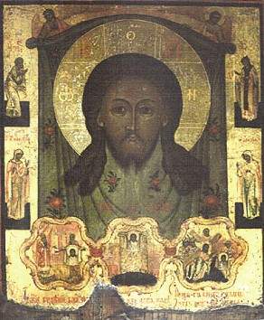 По западному преданию, нерукотворенный образ Спасителя в терновом венке отобразился во время Его крестного пути. Когда с изнеможенного под тяжестью креста Иисуса шел в большом количестве кровавый от тернового венка пот, то в это время одна иудейка, по имени Вероника, отерла Его лицо платом, и в этот же момент на плате отпечатлелся нерукотворенный лик Спасителя в терновом венке. Это лик называется Вероникиным.[302]
