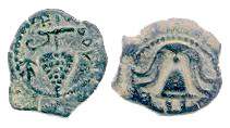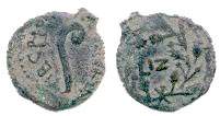 Монета Антигона. Бронза. 25 мм. Аверс: два рога изобилия и еврейская надпись. Реверс: венок и греческая надпись.