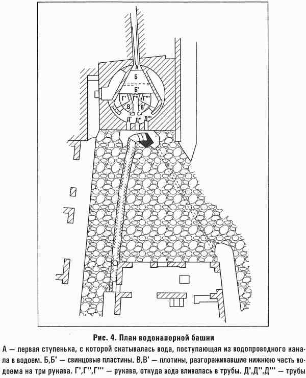 Прежде чем пускать воду в общегородские резервуары и в частные дома, ее поднимали вверх с целью ослабить давление ее на трубы. По всему городу в различных его местах и уже обязательно на перекрестках стояли высокие (больше 6 м) узкие (площадь их 1–1,5 кв. м) столбы, сложенные из кирпичей и отштукатуренные ( {6}). На одной стороне такого столба сделана глубокая выемка, в которую укладывали прочную свинцовую трубу около 15 см в диаметре. По ней вода из водопровода поднималась до свинцового резервуара, стоявшего на верху столба, и только оттуда по целому ряду более мелких труб разбегалась дальше в разные стороны (на одном из столбов сохранилось большое количество таких труб). Подобного рода распределительные колонки можно еще и посейчас видеть не только в Помпеях, но и в Палермо (куда их занесли арабы), в Константинополе и во множестве еще и других древних мусульманских городов.