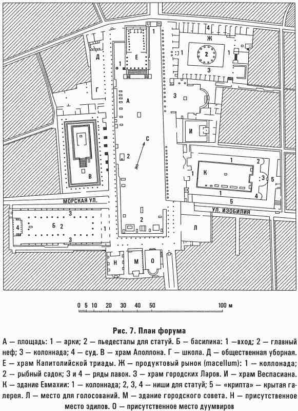 Античный форум, или, иначе говоря, городская площадь, как в Риме, так и в самых даже захолустных городках, италийских и провинциальных, был сердцем города, центром его жизни, и жизнь эта раскрывалась здесь в самых разнообразных аспектах. Управление городом сосредоточено на форуме: здесь заседает городской совет и происходят выборы магистратов; здесь по избрании приносят они свою присягу и с особого возвышения обращаются к народу с официальными сообщениями. Отсюда, если они честно послужили городу, отправятся они в свой последний путь, и прощальные слова благодарности и печали прозвучат над их погребальным ложем на том самом месте, которое при жизни было главной ареной их деятельности. На форум по праздникам стекается весь город: здесь от лица всей общины совершают жертвоприношения; магистраты угощают народ и устраивают для него пышные зрелища. Ежедневно с раннего утра на форуме идет бойкая торговля самыми разнообразными товарами; с утра до вечера толчется здесь народ, деловой и праздный; здесь заключают торговые сделки, улаживают деловые соглашения, разбирают судебные дела и здесь же завязываются романы, сюда приходят на свидания, и непринужденная болтовня собравшихся приятелей кончается иногда созданием какой-нибудь потрясающей политической новости, у которой, по едкому замечанию покорителя Македонии Эмиля Павла,[22] «никогда не бывает отца». Форум италийского города — не простая площадь, это архитектурно оформленное пространство, которое надлежит приспособить к самым разнообразным требованиям городского общежития. Его надо устроить так, чтобы весь город радовался на него и любовался им и чтобы каждый чувствовал себя здесь как дома и приходил сюда как домой. Форум следует сделать и величавым, и красивым, и уютным. Понятие «уют» не вяжется у нас с представлением о площади; и к деловой толкотне рынка, и к строгому великолепию Дворцовой площади в Ленинграде меньше всего подходит эпитет «уютный». Форумы древних городов были уютны уже потому, что под них не захватывали очень больших пространств. Когда Витрувий[23] говорит, что «величину форумов следует сообразовывать с количеством людей: площадь не должна быть мала для практических целей, но и не должна казаться пустынной вследствие малолюдства», то эти слова только формулируют многовековую практику древних архитекторов. Даже римский форум к концу республики занимал площадь длиной только в 160 м и шириной от 50 до 80 м, а самый великолепный из императорских форумов — форум Траяна[24] — имел в длину 116 м и в ширину 95 м. Сами по себе малые размеры, однако, уютности еще не сообщают. Тонкое художественное чутье греков и стремление их к ясным, определенным формам подсказали им необходимость четкого выделения их площадей из окружающего пространства, и этот урок греческого градостроения был хорошо усвоен их италийскими учениками. Форум огораживают портиками, обычно двухэтажными; на нем и около него воздвигают прекрасные храмы и величавые здания, служащие для нужд городской жизни, деловой и религиозной. И в то же время портики, окружающие форум, придают ему какое-то неуловимое сходство с самой уютной, домашней, если можно так выразиться, частью италийского дома, с перистилем, и превращают его, говоря современным языком, в своеобразную гостиную для всего города. История форума в Помпе