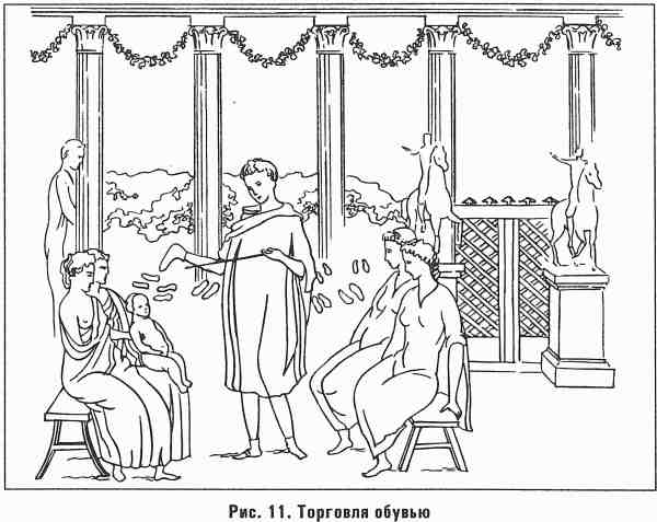 У нас есть почти документальное изображение жизни на форуме: несколько фресок, правда, фрагментарных, найденных еще при начале раскопок в 1755 г. в одном помпейском доме. При своем художественном несовершенстве бытовые картинки, представленные этими фресками, очень ценны. Люди, изображенные художником, часто напоминают деревянные обрубки, но ему удалось передать и выразительность их жестов и поз, и оживленную пестроту форума; перед нами воскресает торговая и ремесленная жизнь Помпей. Вот торговля тканями (рис. 8). Продавец раскинул в одном месте перед портиком свою будочку, обтянутую полотном; там лежат ткани; самая торговля происходит в тени портика. Двое покупателей рассматривают развернутую штуку сукна; один из них нашел в нем какой-то недостаток и пальцем указывает на изъян; продавец поднимает руку жестом человека, который ручается, что счастливец, купивший это сукно, проносит его до смерти. За покупателями в классической позе вышколенной служанки стоит девушка-прислужница. Направо — другой торговец, вероятно компаньон первого, убеждает покупательницу, прикидывающую на себя кусок сукна, в высоких качествах материала. Спутница ее, дочь или младшая сестра, живо заинтересована покупкой; умоляющим жестом она кладет руку на плечо старшей. Разносчики готового платья (рис. 9), разгуливающие по форуму, беседуют с покупательницами, которые, как это повелось уже от века, вероятно, сомневаются и в достоинстве товара, и в разумности назначенной за него цены. Сапожник примеривает сапоги юноше, усевшемуся для этого на скамейку (рис. 10); его товарищ или хозяин обращается к кому-то, приглашая взглянуть на ряды выставленной обуви. В другой сапожной (рис. 11) молодой мастер, надев башмак на руку и вооружившись палочкой, похожей на школьную указку, объясняет своей аудитории, состоящей из четырех женщин и крохотного ребенка, сидящего на руках, изумительные качества своего товара. Тут же приютился медник (рис. 12): юный подмастерье возится у переносного горна; покупатель рассматривает на свет ведро, а сам хозяин занят запаиванием маленького котелка. На земле стоит посуда разной формы и величины.