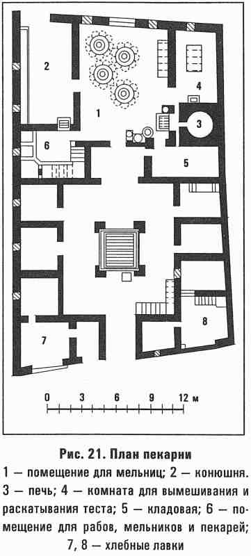 считалось, что «самые благородные вина должны после разлива находиться под открытым небом, подвергаясь действию солнца, луны, дождя и ветров». Правильными рядами, засыпанные песком почти до горлышка (находясь в земле, вино не подвергается воздействию перепадов температуры) стояли здесь винные амфоры. Помещение для вина должно было хорошо проветриваться: кроме трех больших и пяти маленьких окон, в наружной стене погреба был сделан ряд узких, во всю ее длину идущих щелей; при малейшем ветерке в помещении получался сквозняк. В древней Италии очень любили сладкий, почти приторный сироп, который получался от выпаривания виноградного сока до 2/3, а то и до 1/3 первоначального объема. В больших имениях для приготовления такого напитка отводили отдельное помещение, но в усадьбе под Боскореале для него назначили уголок в «погребе»: выкопали яму, утвердили над ней большой свинцовый чан (диаметром 1 м, глубиной 1,35 м); а в стене напротив сделали внизу небольшое отверстие, через которое с улицы и разводили под чаном огонь. Оливковый сад при усадьбе был значительно меньше виноградника; в этом убеждает значительно меньшая величина маслодельни (Щ и Э). Прежде чем класть оливки под пресс, их разминали с помощью особой мельницы, называвшейся «трапетом»; она стояла в (Э). Полученное тесто клали на точильную площадку (1) уже знакомого нам вида (2x2,25 м; сравним точильные площадки для винограда около 4,5x4,5 м, приподняты над полом на 0,4 м); масло стекало отсюда в круглый глиняный чан (2) — «двойню» (он назывался так потому, что внутри был перегорожен пополам тонкой стенкой). Перед ним стоял тоже круглый и глиняный, но небольшой сосуд, вмурованный в пол; туда сливали, вероятно, масло самого высокого сорта. Между маслодельней и точилом находились каморки для рабов (X). Судя по их крохотным размерам, они предназначались для одного, много для двух человек; по всей вероятности, их занимали люди, приставленные работать на маслодельне; работа эта требовала постоянного присутствия и большого внимания: надо было поддерживать идеальную чистоту, осторожно переливать масло из одного сосуда в другой, убирать выжимки и сливать отстой. Каморки разделял глухой коридор (Ч), где на каменном выступе стояла ручная мельница; в свободное от своих непосредственных занятий время маслоделы могли намолоть себе муки. Маленький светильник, для которого сделана была в стене специальная ниша, освещал это темное помещение. Вся эта часть усадьбы особенно оживлялась осенью, когда давили виноград, и глухой зимой во время приготовления масла (оливки обычно снимали в Италии в ноябре — декабре). Над (Ч, X) и прилежащей частью коридора (Р) был надстроен второй этаж: столовая с широким окном на погреб и четыре спальни — явно помещение для хозяина. Кампания была страной не только виноградников и садов; ее хозяйственный пейзаж неизменно включает в себя хлебные поля, и присутствие хлебных культур в усадьбе под Боскореале засвидетельствовано наличием тока и сарая для хлеба. Ток (У) представляет собой прямоугольную площадку (11x13,5 м), приподнятую над уровнем земли на 1 м (так же как и погреб С и сарай Т). Дождевая вода стекала с него через глиняную трубку в бассейн (Ф), устроенный под площадкой. Земля на току была не просто убита, как это рекомендовалось Катоном, а залита особой массой из гипсового цемента, смешан